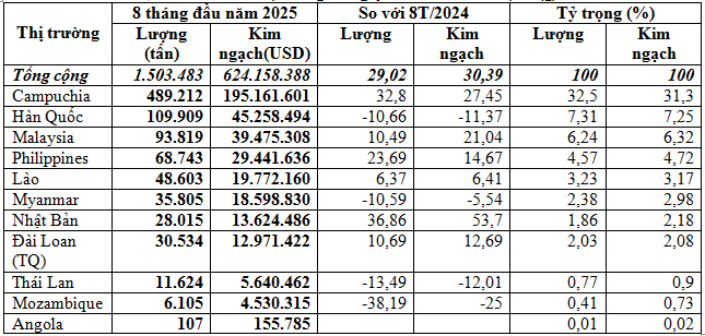 Phân bón của Việt Nam xuất khẩu nhiều nhất sang thị trường Campuchia, chiếm 32,5% về lượng và chiếm 31,3% về kim ngạch trong tổng xuất khẩu phân bón của cả nước, đạt 489.212 tấn, trị giá 195,16 triệu USD, giá trung bình 398,9 USD/tấn; tăng 32,8% về lượng, tăng 27,5% về trị giá nhưng giảm 4% về giá so với 8 tháng đầu năm 2024.